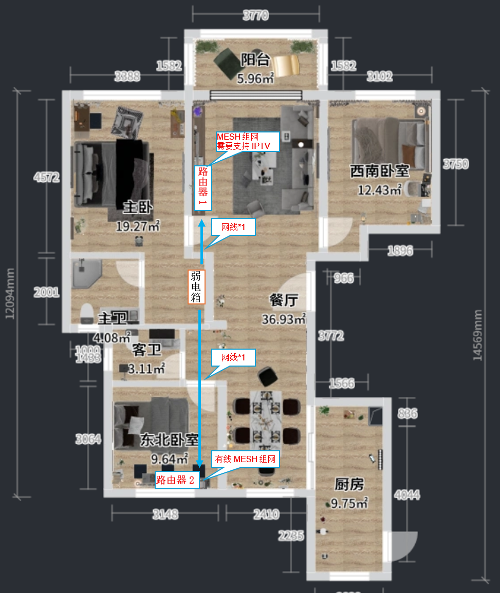 我怎么感觉在餐厅弱电箱墙背面挂一个路由器就搞定了呢😂可能是我肤浅了。我家里原来是在弱电箱放了一个红米 6000 ,然后把光猫出来的线和通往其他地方见的网线都插上去,家里的三台红米 6000 就自动有 mesh 了