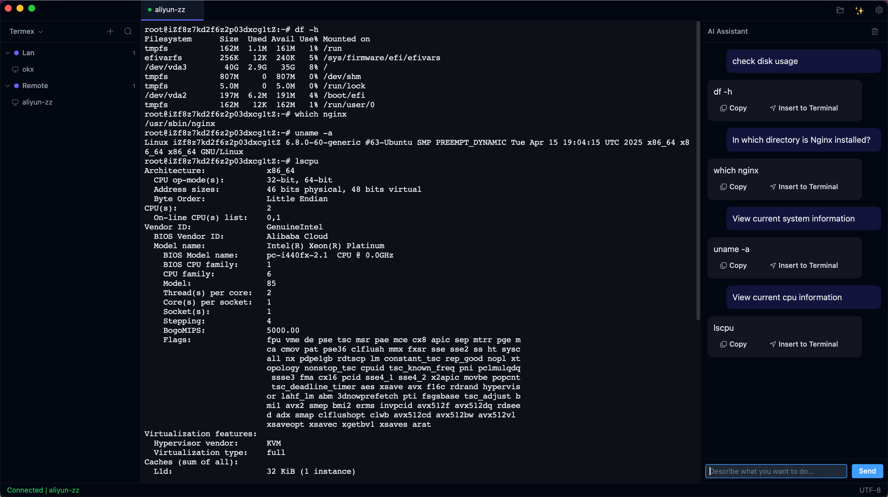 1 、OPC 时代,并非每一个 agent 工程师都能记住所有的 liunx 命令,在一个客户端内实现 AI 辅助运维支持,会变得非常高效。 2 、侧重本地离线模型实现 ai+系统钥匙串,实现用户隐私主权的 ai ssh 客户端。 3 、后面考虑实现完整的 ai 任务工作流,例如:服务器资源资源占用分析、直接部署某个中间件程序、清理磁盘将 7 天之外的日志全部删除并建立自动日志清理机制。将 AI 工作流引入到自动化运维过程中。 |